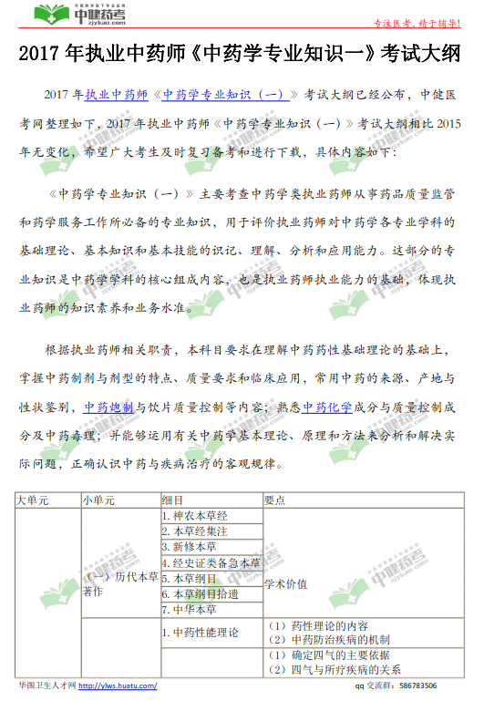 由中国卫生人才网为您整理,根据2017年执业中药师《中药学专业知识一》考试大纲整理,2018年执业中药师《中药学专业知识一》考试大纲。为了方便考生备考,华图中国卫生人才网小编为大家编辑整理了2018年药师考试大纲,考生可免费进行2018年药师考试大纲下载或复制。2018年全国执业药师考试群:586783506